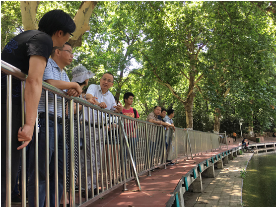 26日 ,武汉市园林和林业局局长周耕、局规划处和建设处负责人一行冒着高温酷暑来到中山公园,对备受市民关注的湖水治理工作进行调研。