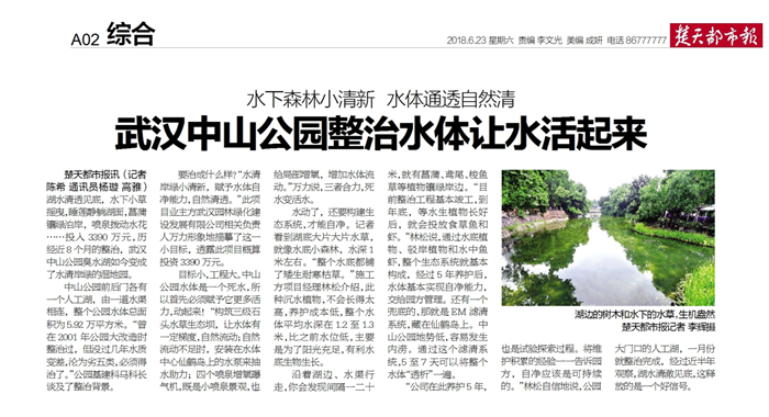 沿着湖边、水渠行走,你会发现间隔一二十米,就有菖蒲、鸢尾、梭鱼草等植物镶绿岸边。“目前整治工程基本竣工,到年底,等水生植物长好后,就会投放食草鱼和虾。”林松说,通过水底植物、驳岸植物和水中鱼虾,整个生态系统就基本构成,经过5年养护后,水体基本实现自净能力,交给园方管理。还有一个兜底的,那就是EM滤清系统,藏在仙鹤岛上。中山公园地势低,容易发生内涝。通过这个滤清系统,5至7天可以将整个水体“透析”一遍。“公司在此养护5年,也是试验探索过程。将维护积累的经验一一告诉园方,自净应该是可持续的。”林松自信地说,公园大门口的人工湖,一月份就整治完成,经过近半年观察,湖水清澈见底,这释放的是一个好信号。(本文章发表于武汉楚天都市报2018.6.23期刊A02综合版面)